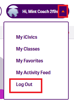 6. When you are done using iCivics, please log out by clicking on your profile drop-down menu in the right-hand corner and click Log out.
