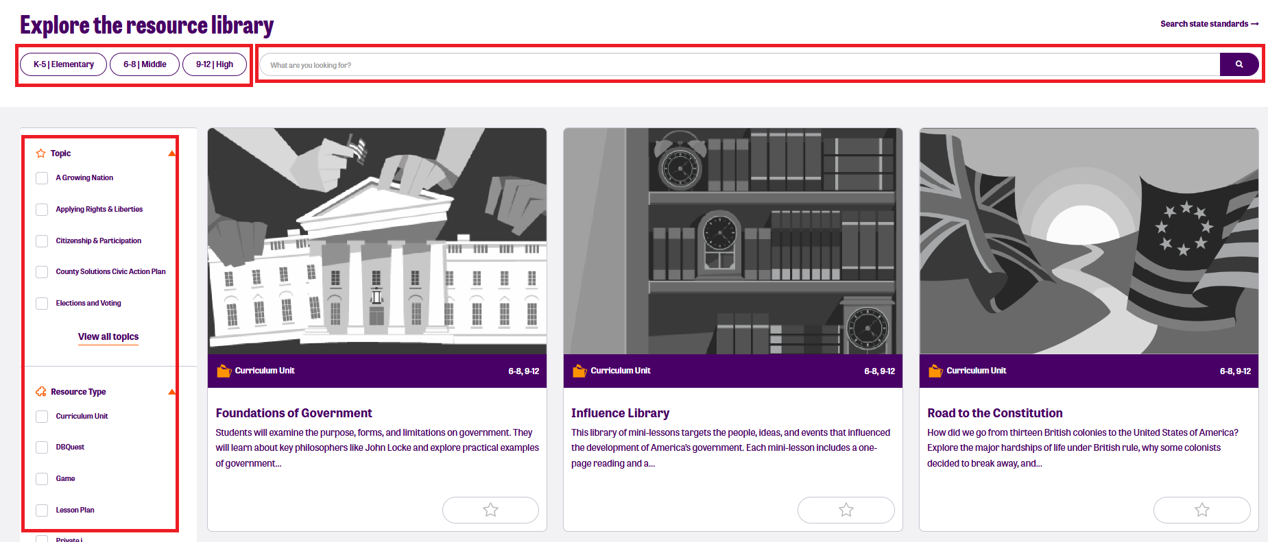 Click on the Teach tab to access various resources to use in the classroom. You can search for items using the Search bar or filter resources by grade levels, topics, and types.