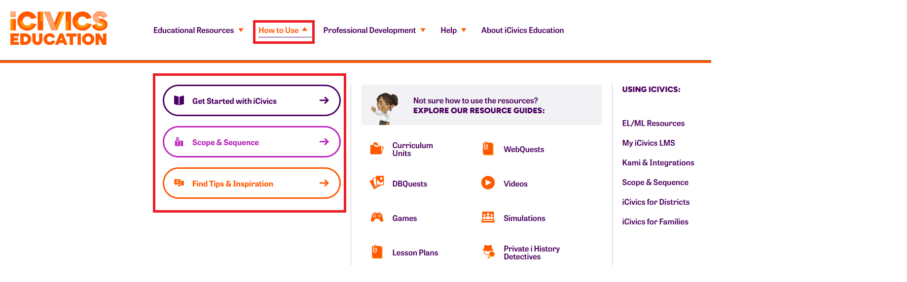 Click on the How to Use iCivics tab to access help guides, Scope & Sequences, and tips for use.
