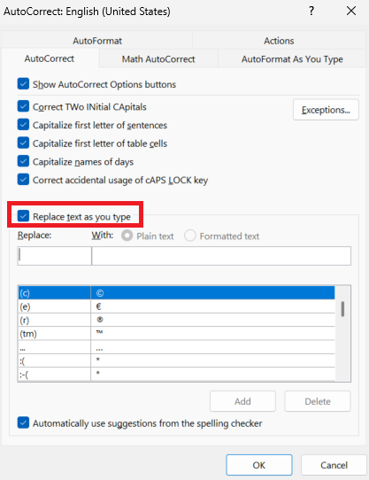 3. Click the checkbox next to Replace text as you type so it shows a check.