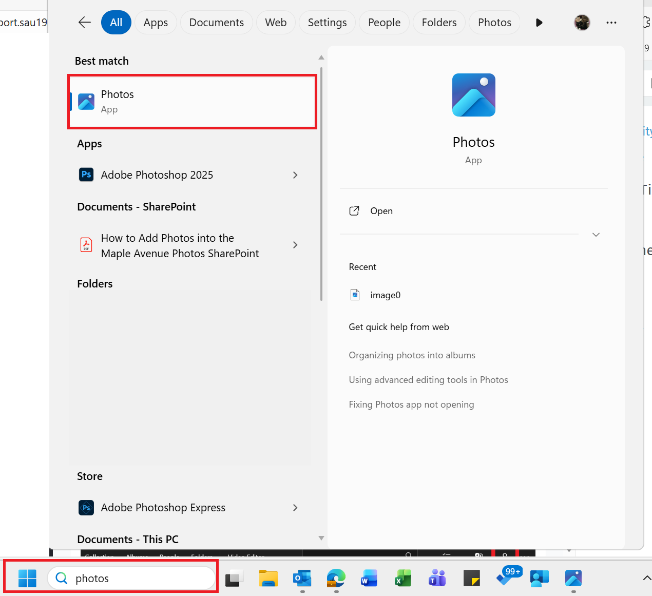 1. Locate the Photos app on your PC, by typing Photos into the search bar located in the Taskbar on the bottom of your computer screen and click on the Photos app icon.