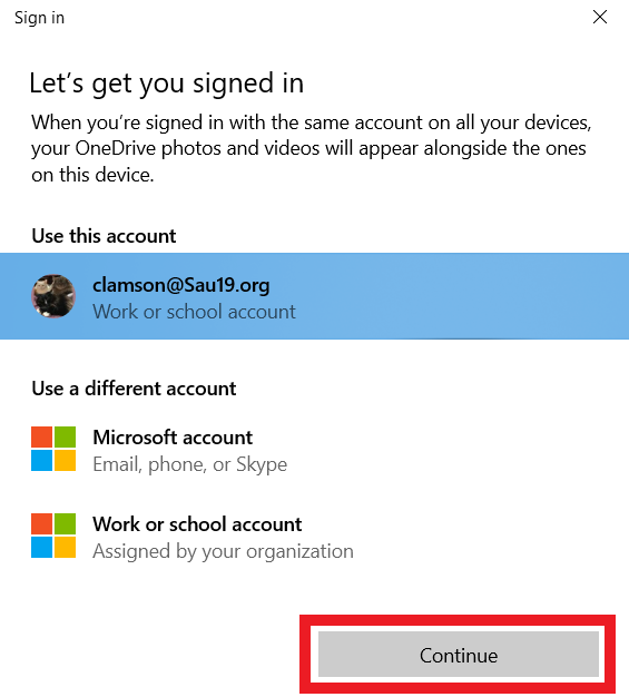 If you are prompted to log in, log in using your Microsoft account credentials (remember to use @sau19.org at the end of your username) and click Continue.