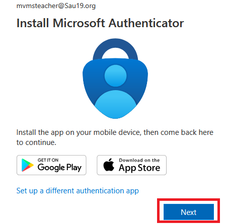 4. You will be prompted to download the Microsoft Authenticator app on your phone. Visit your device's app store and download this app. Once the download is complete, click Next.