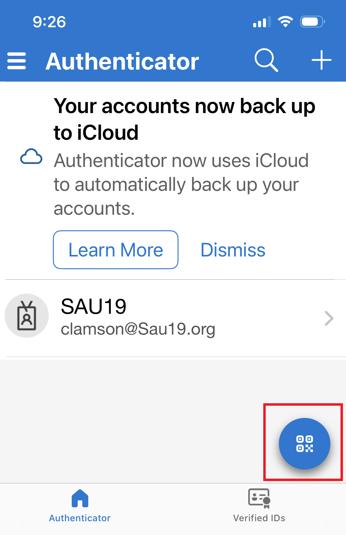 2. Open the Microsoft Authenticator app and click the QR Code icon in the bottom right-hand corner.